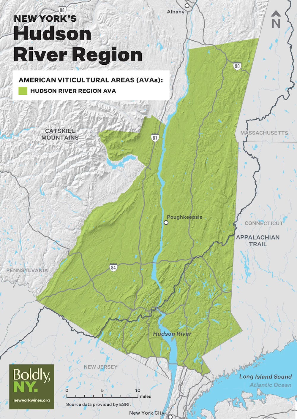The Hudson River Region is one of New York’s seven sub-regions and it begins about 35km north of New York City, flanking either side of the mighty Hudson River for about 155km. With a total of about 180ha (446 acres) under vine, the region is significantly smaller than the powerhouse regions of the Finger Lakes and Long Island, and is planted with a mix of vinifera and hybrid varieties. With its cool continental climate, the success of viticulture here is largely due to the moderating influence of the Hudson River, and a vineyard’s proximity to the river can be a determining factor as to what varieties will be successful where.