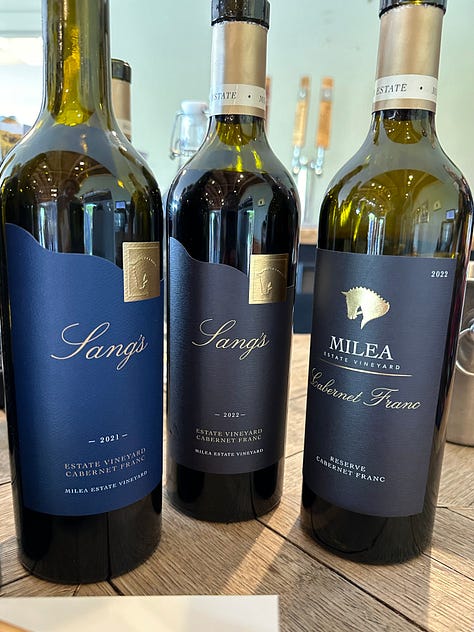 Milea Estate Vineyard: 2022 Sang’s Cabernet Franc, 2022 Reserve Cabernet Franc. 2021 Sang’s Cabernet Franc