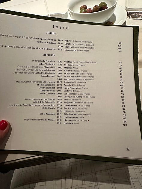Now, I fully expected Pascaline to know her list inside and out, and she did manage to chat a bit about some of the selections amidst a busy Friday evening service. But I must give a special shout out to sommelier extraordinaire Ellis. Not only did they suggest new producers that I had yet to try, Ellis was able to go toe-to-toe with me answering all of my nerdiest questions with ease and confidence. What side of the Vienne is the village on? What commune in Anjou is the lieu-dit? What is the soil are we dealing with here? What philosophical camp does this vigneron subscribe to? Etc.