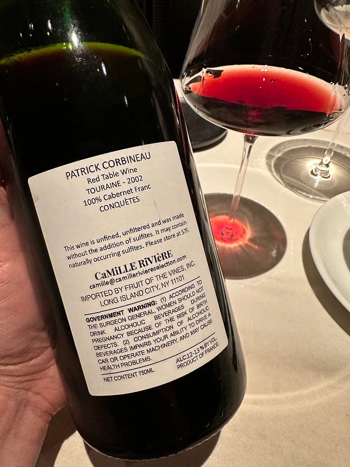 Patrick Corbineau, 2002 “Conquètes” Touraine Rouge: From the commune of Candes-Saint-Martin, on the plateau on the southwest corner of where the Vienne River meets the Loire River. While this commune is now part of the expanded version of Chinon, this village has more in commune with the neighbouring commune of Montsoreau, which is part of the Saumur-Champigny appellation positioned squarely on the tuffeau on the plateau on the southside of the Loire. From what Pascaline and Ellis shared, Patrick is one of the most humble and gracious vignerons out there. From the banner 2002 vintage, this wine was absolutely singing. It is very much in the traditionalist camp, and if you have ever had the pleasure of enjoying a wine from Jérôme Lenoir, then this wine is along those same veins. While Jérome’s wines tend to have a bit more meat on their bones, this was a lean and lithe Cabernet Franc, laser-focused, poised and enchanting.