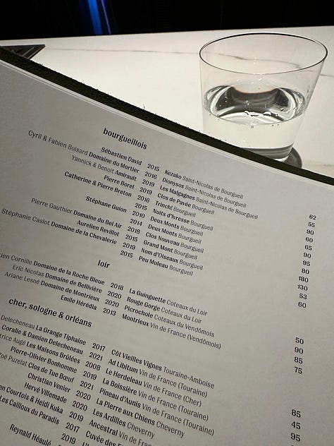 I dream that one day there are Loire Cabernet Franc lists like this all over. Each restaurant with their own “Ellis” (or two!) that can wax poetically (if asked) about the many limestones in Saumur and Saumur-Champigny, the communes in Chinon, and Bourgueil lieux-dits… or that can suggest that the early-drinking Chinon from the gravelly soils in Cravant-les-Côteaux will be a fine match for the roast chicken… or that the Grand Mont from Bourgueil should really be decanted and would need a fine steak for those tannins to cut through… or that the perfumed and ethereal Saumur Rouge is crying out for the duck confit with sour cherry-thyme compote… le sigh….