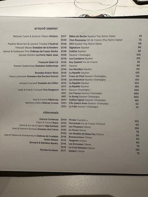 First of all, there must’ve been at least 50+ Cabernet Francs here. Second, the selections were broken down by appellation (Saumur, Chinon, Bourgueil, etc). This is NOT normal folks. In most restaurants, I expect to see one or two Loire Cabernet Franc (if any), and once in a blue moon, maybe there’s a half a dozen. But this. This kind of wine list only happens in my dreams. And if that wasn’t enough, it hit a diverse range of price points and vintages, new and back vintage, AND there were some familiar names, of course, but plenty for a Loire nerd like me to explore.