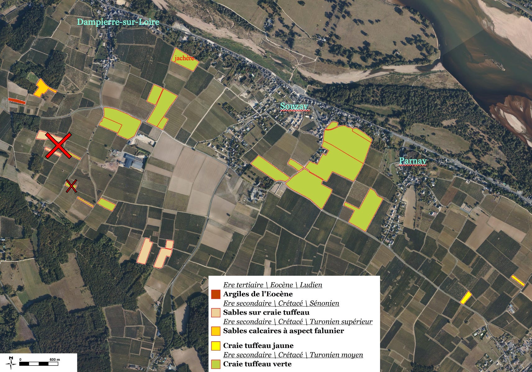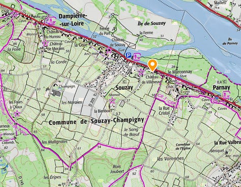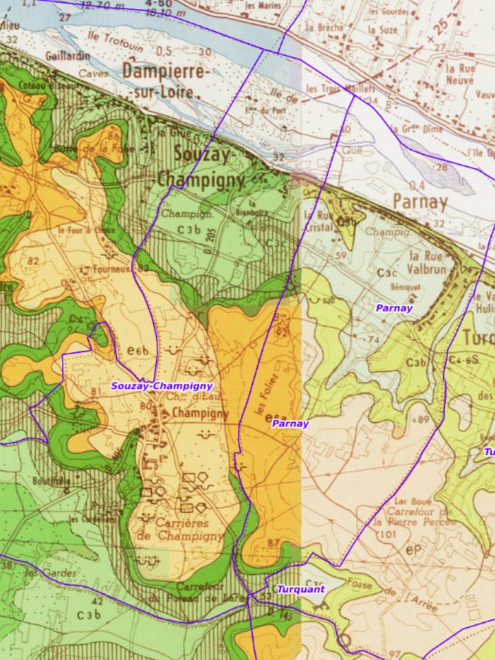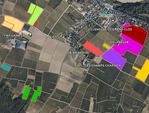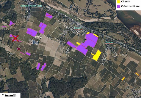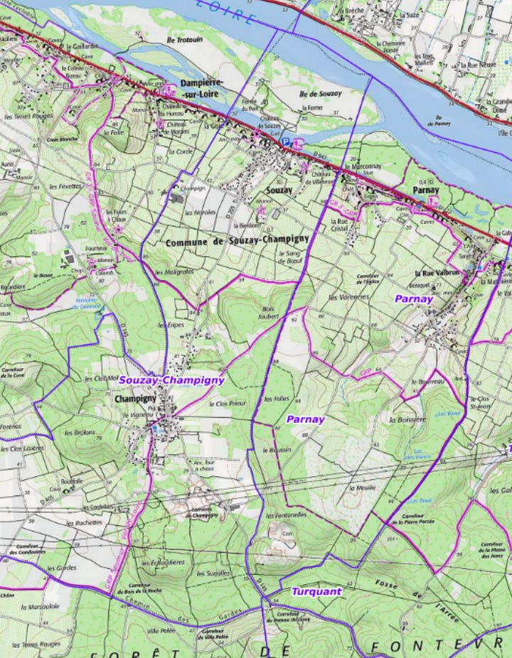 Château de Villeneuve has about 25 hectares of vines, 20 of which are Cabernet Franc (the balance planted with Chenin Blanc1), across fourteen lieux-dits, with the majority of the parcels concentrated on the plateau of Souzay-Champigny with some parcels in neighbouring Dampierre-sur-Loire to the west and Parnay to the east.